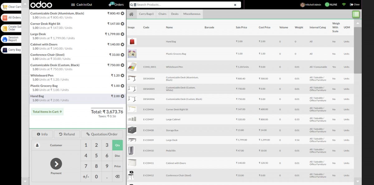 Mô-đun POS của Odoo có tính năng quản lý sản phẩm nâng cao, cho phép doanh nghiệp sắp xếp và xem sản phẩm của họ một cách hiệu quả. Với các tùy chọn phân loại có thể tùy chỉnh, các sản phẩm có thể được sắp xếp theo mức độ phổ biến và được nhóm thành các danh mục khác nhau, giúp đơn giản hóa phần POS và tối đa hóa tương tác sản phẩm. Tính năng này cho phép khách hàng khám phá và lựa chọn sản phẩm một cách thuận tiện dựa trên sở thích và thuộc tính mong muốn của họ, nâng cao trải nghiệm mua sắm tổng thể.