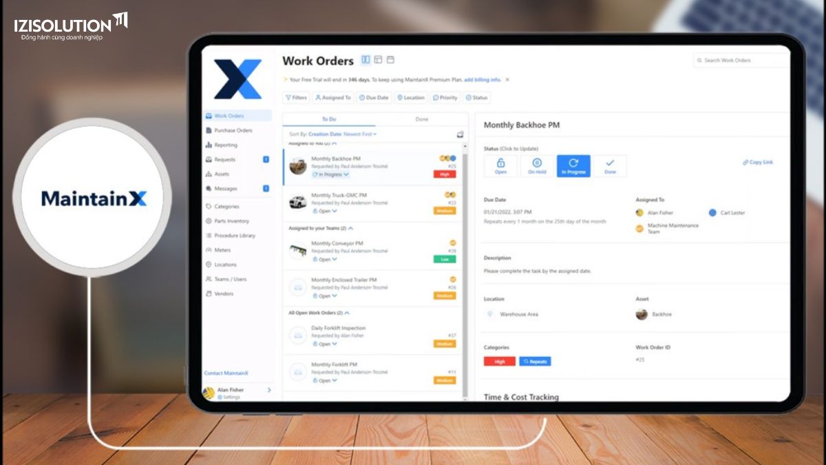 Maintain X là phần mềm giúp doanh nghiệp cải thiện hoạt động liên lạc hàng ngày trong bộ phận bảo trì và quản lý số lượng lớn tài sản, thiết bị. Phần mềm thân thiện với người dùng của họ cho phép người dùng quản lý lệnh sản xuất một cách hiệu quả bằng cách tự động hóa các tác vụ lặp đi lặp lại. Ngoài ra, nó khuyến khích nhân viên chủ động thông qua nhắn tin theo thời gian thực, loại bỏ tình trạng tồn đọng hoặc tắc nghẽn. Maintain X cũng giúp giảm chi phí bằng cách tạo báo cáo kịp thời với thông tin chi tiết minh bạch về những gì cần được cải thiện vào đúng thời điểm.