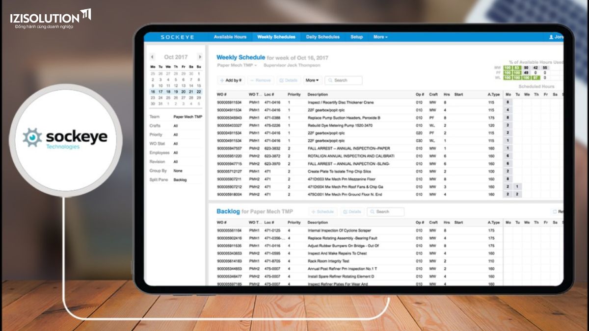 Sockeye là một nền tảng được sử dụng để lên lịch bảo trì và quản lý tài sản. Nó có một đầu nối cố định giúp cập nhật các hồ sơ tồn đọng và tạo lịch trình lệnh sản xuất từ những hồ sơ này. Nó giữ cho dữ liệu quan trọng được đồng bộ hóa và loại bỏ phần lớn dữ liệu cần xử lý trước. Ngoài ra, Sockeye tăng thời gian hoạt động bằng cách tự động hóa các tác vụ và cung cấp thông tin chi tiết thông qua phân tích và KPI thời gian thực.