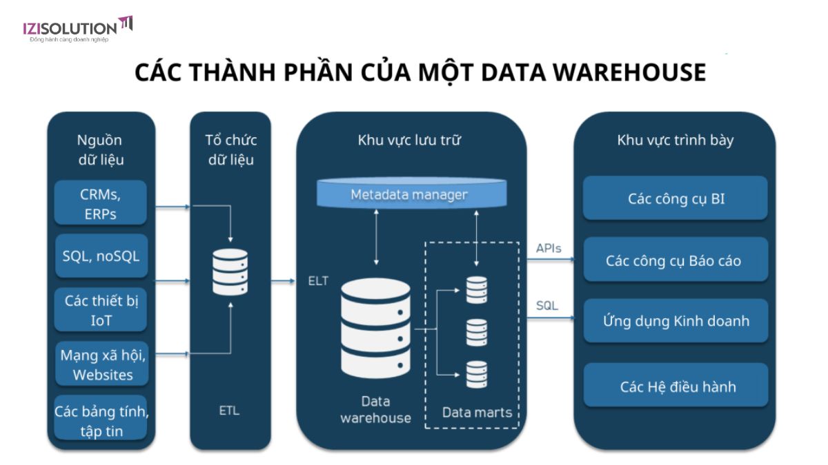 Data Warehouse là một hệ thống phức tạp, bao gồm nhiều thành phần quan trọng hoạt động cùng nhau để cung cấp một nền tảng quản lý dữ liệu mạnh mẽ và hiệu quả.
