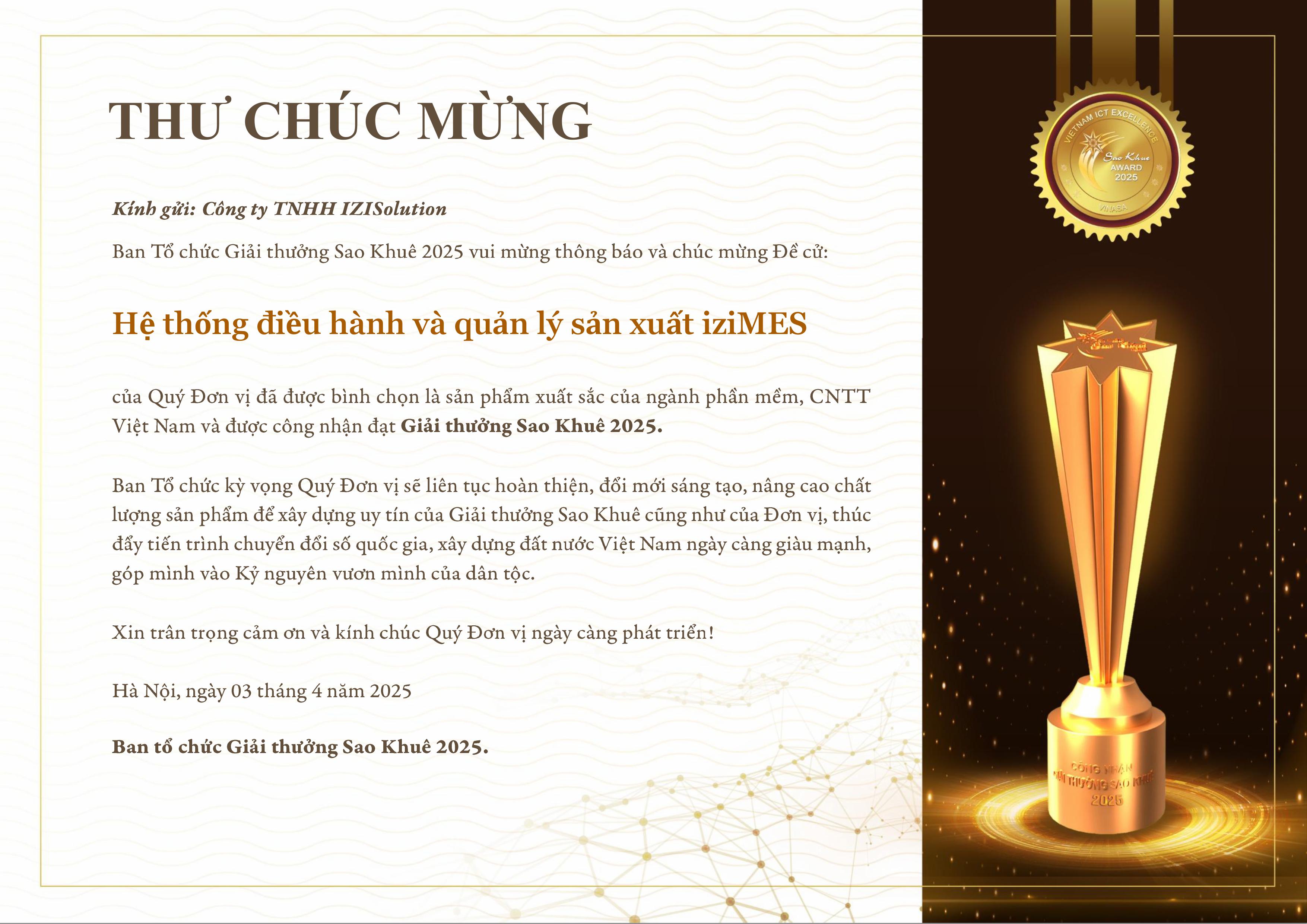 Giải thưởng Sao Khuê do Hiệp hội Phần mềm và Dịch vụ Công nghệ thông tin Việt Nam (VINASA) tổ chức thường niên nhằm vinh danh các sản phẩm, giải pháp công nghệ xuất sắc có đóng góp lớn cho sự phát triển của ngành công nghệ thông tin và nền kinh tế quốc gia. Với tiêu chí đánh giá khắt khe, giải thưởng không chỉ là sự công nhận về mặt kỹ thuật mà còn là minh chứng cho giá trị mà sản phẩm mang lại cho người dùng và thị trường.Việc iziMES được vinh danh trong nhóm sản phẩm Quản trị doanh nghiệp toàn diện là minh chứng rõ nét cho chất lượng, hiệu quả và sự đổi mới mà hệ thống này mang lại. Đây là một bước tiến quan trọng, khẳng định vị thế của iziMES trong lĩnh vực công nghệ quản trị sản xuất và doanh nghiệp tại Việt Nam.