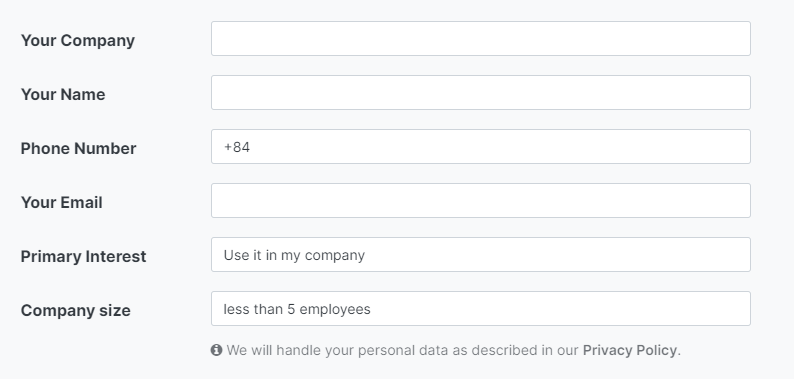Điền các thông tin theo bảng yêu cầu gồm: Tên công ty, tên người dùng, số điện thoại, email, đối tượng sử dụng, quy mô công ty.