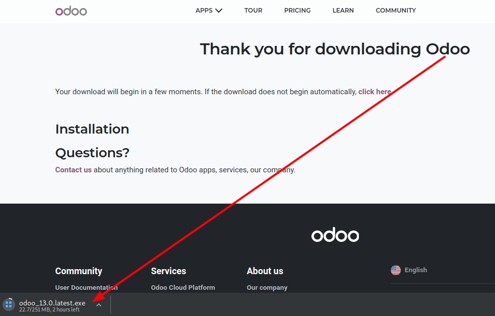 Bước tiếp theo trong khi cài đặt Odoo cho Windows là lưu tệp trên PC của bạn - tệp này có kích thước khá lớn vì nó tải xuống mọi thứ bao gồm cả hệ thống cơ sở dữ liệu PostgreSQL nên có thể mất chút thời gian.