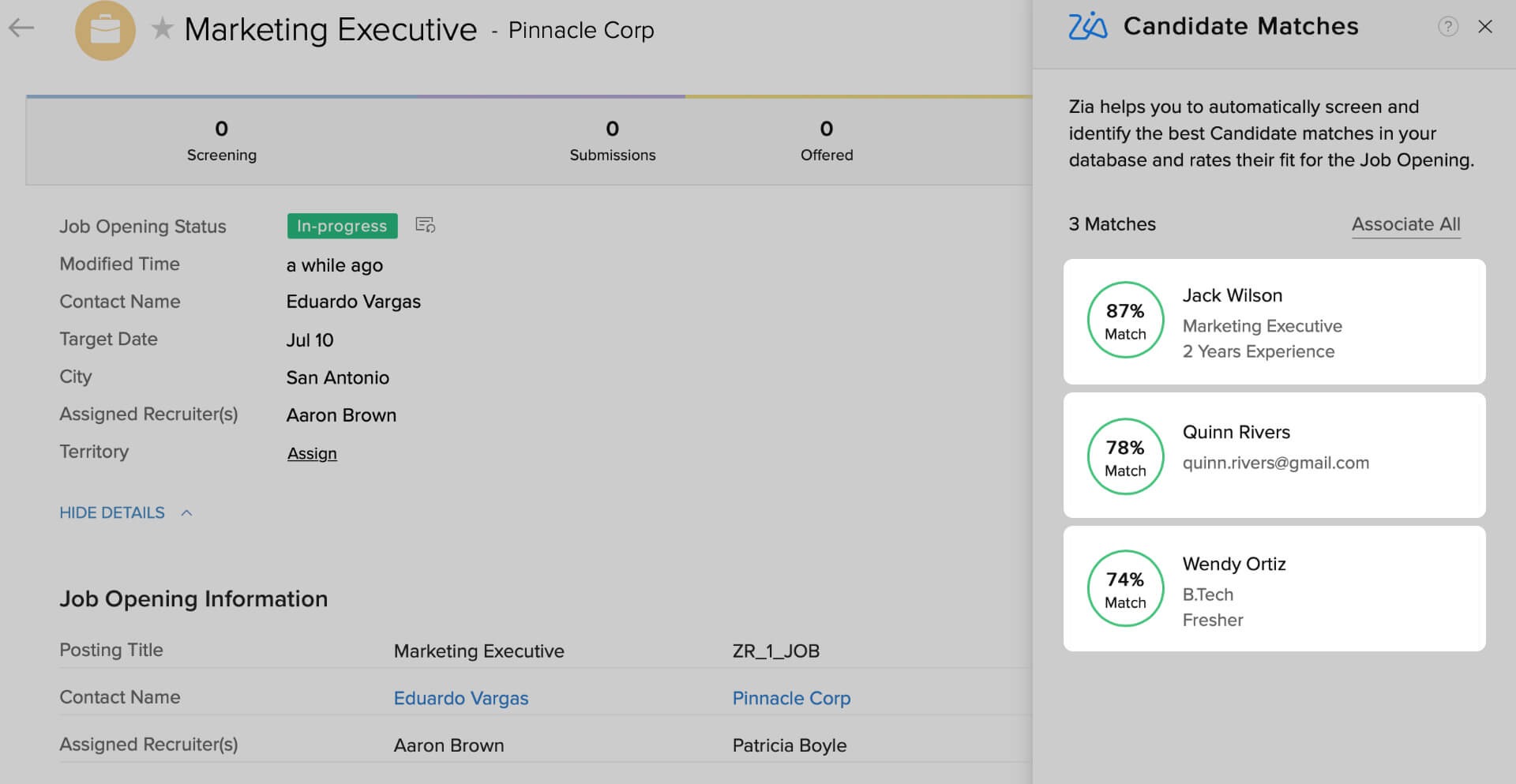 Khi các thiết lập yêu cầu cho ứng viên được kích hoạt, Zoho Recruit sẽ tự động thực hiện các hoạt động tìm kiếm, sàng lọc và lựa chọn ứng viên phù hợp. Điều này giúp tiết kiệm thời gian và giúp doanh nghiệp tìm ra những ứng viên phù hợp với yêu cầu đã định trước.