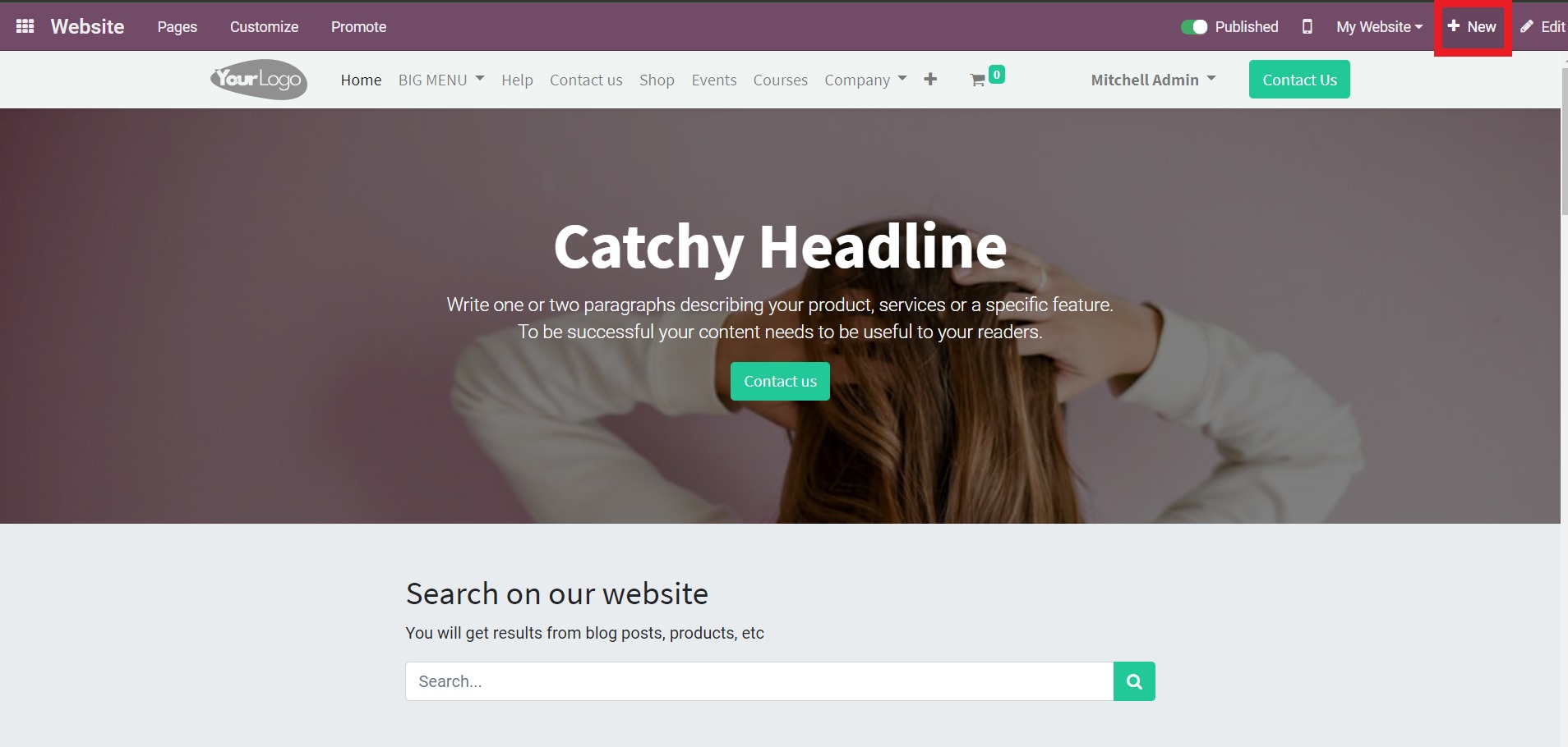Trên trang web Thương mại điện tử Odoo, việc thêm blog rất đơn giản. Chỉ cần truy cập trang web Thương mại điện tử của bạn và nhấp vào New.