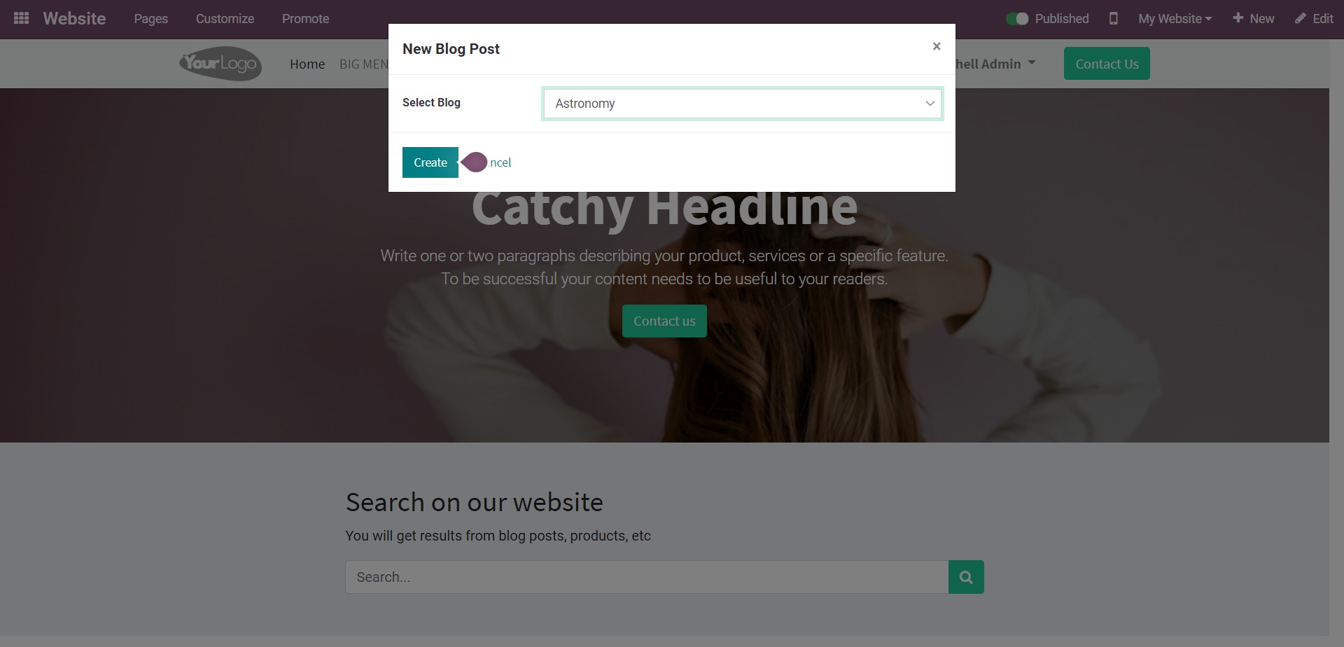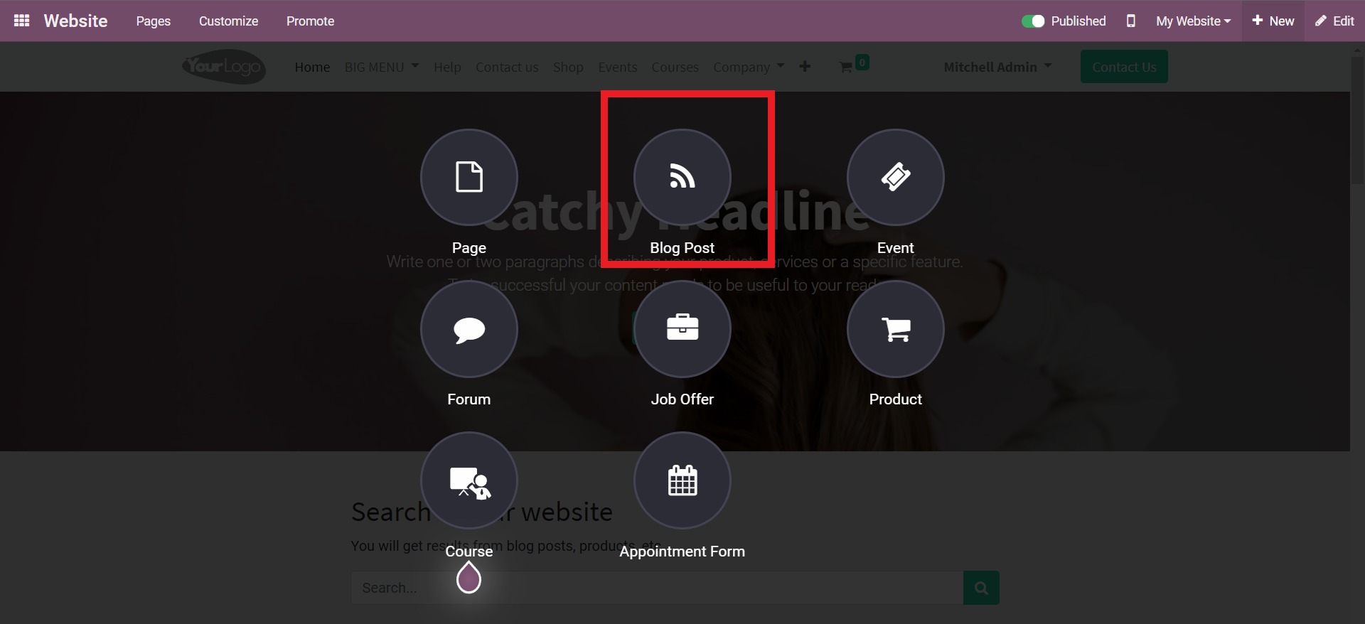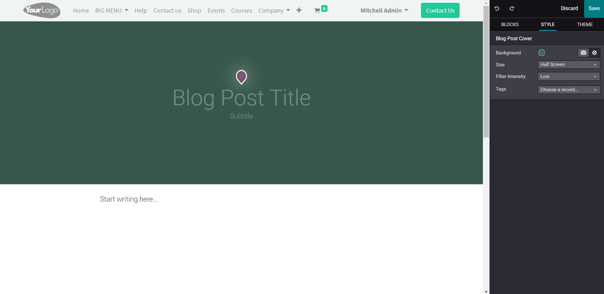 Đặt tiêu đề và phụ đề vào hộp 'Tiêu đề bài đăng trên blog' và soạn blog. Bạn có thể sử dụng các chức năng Khối, Kiểu và Chủ đề của Odoo để thêm ảnh, bối cảnh phụ, thông tin bổ sung, v.v. Các tùy chọn kiểu dáng và chủ đề cho phép bạn thay đổi hoàn toàn giao diện blog của mình.