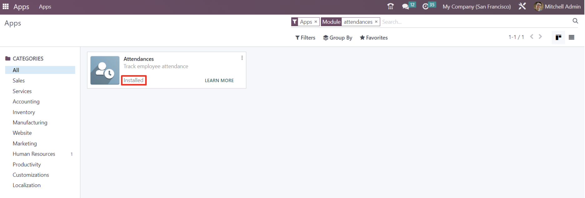 Bước 1: Cài đặt Attendance trên Odoo