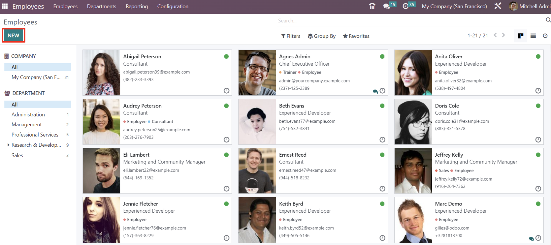 Để add một nhân viên mới, nhấn chuột vào nút New.