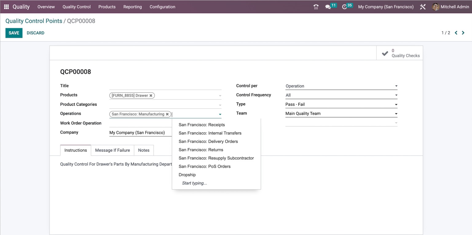 Với Kiểm soát chất lượng của Odoo, bạn có thể kiểm soát chất lượng sản xuất hoặc sản xuất của các nhà thầu phụ.