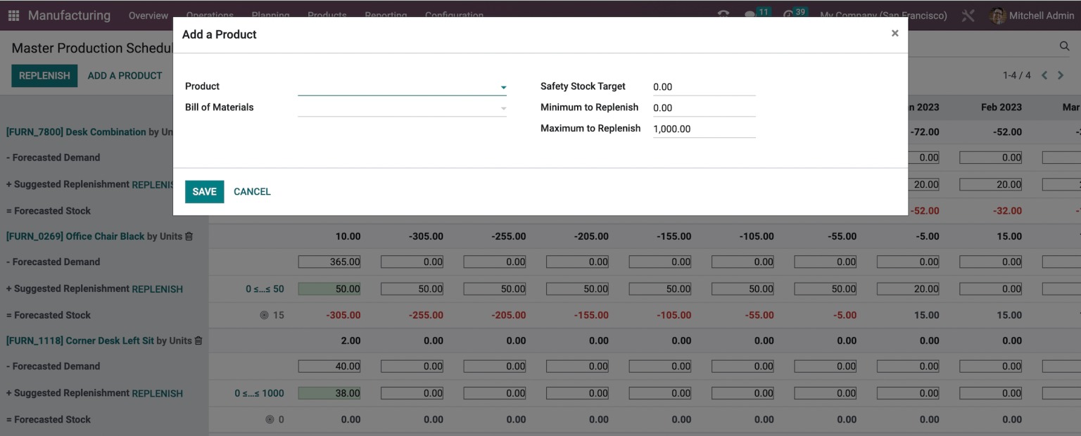 Dựa trên dự báo nhu cầu, các công ty sản xuất có thể lập kế hoạch sản xuất bằng công cụ MPS trong Odoo.