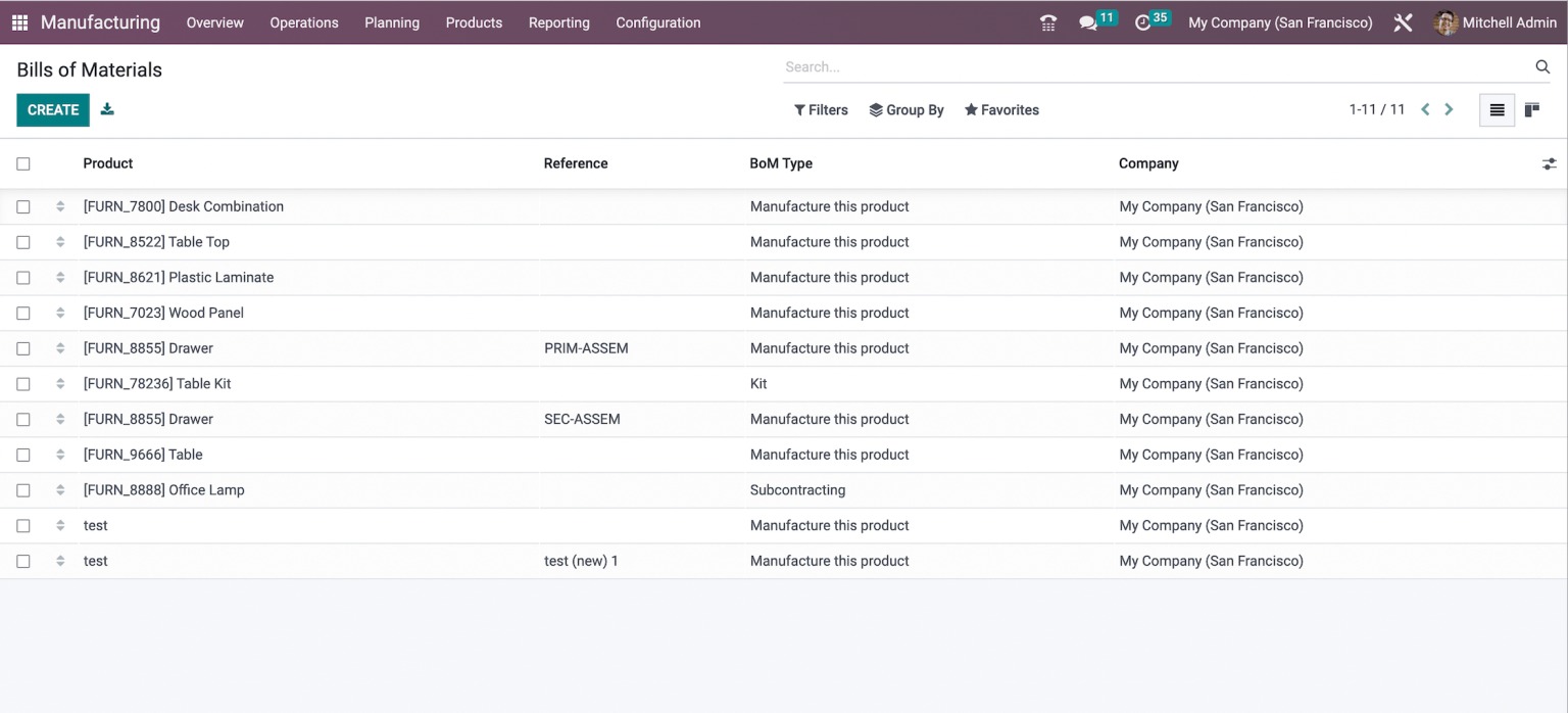 Bạn có thể tạo một hóa đơn nguyên vật liệu trong Odoo Manufacturing ERP như dưới đây: