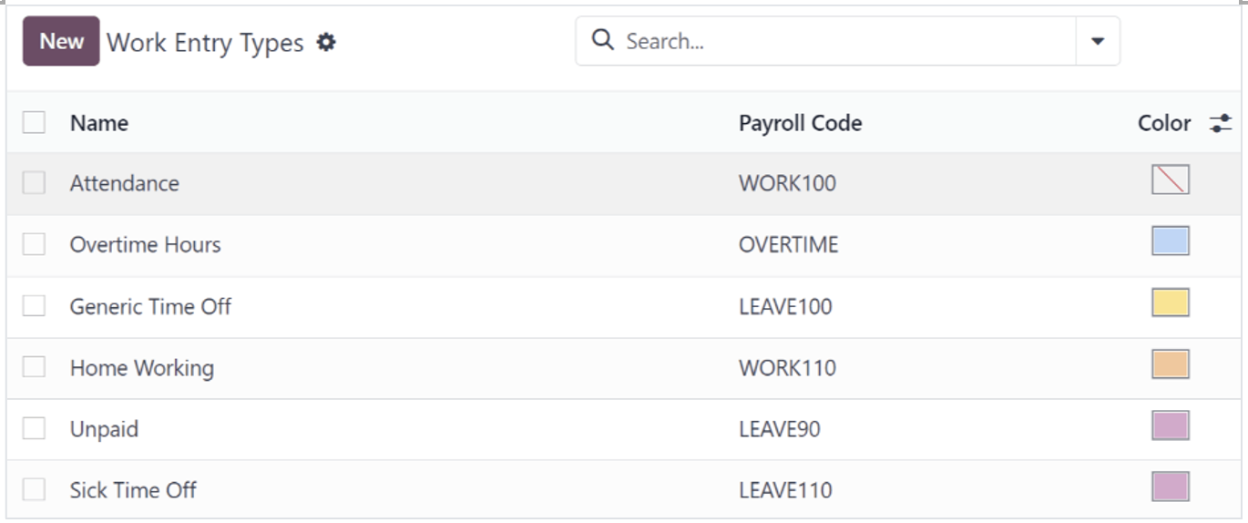 Để xem các loại mục nhập công việc hiện có, hãy vào Ứng dụng bảng lương ‣ Cấu hình ‣ Mục nhập công việc ‣ Loại mục nhập công việc.