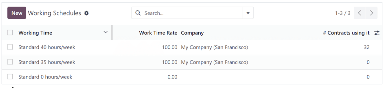 Để xem lịch làm việc hiện được cấu hình, hãy vào ứng dụng Payroll ‣ Configuration ‣ Work Entries ‣ Working Schedules. Lịch làm việc có sẵn cho hợp đồng và mục nhập công việc của nhân viên được tìm thấy trong danh sách này.