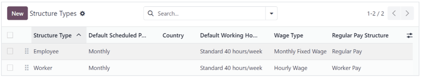 Trong Odoo, phiếu lương của nhân viên dựa trên các cấu trúc và loại cấu trúc, cả hai đều ảnh hưởng đến cách nhân viên nhập bảng chấm công. Mỗi loại cấu trúc là một tập hợp các quy tắc riêng để xử lý mục nhập bảng chấm công, bao gồm các cấu trúc khác nhau được lồng vào bên trong. Các loại cấu trúc xác định tần suất nhân viên được trả lương, giờ làm việc và liệu tiền lương có dựa trên mức lương (cố định) hay số giờ nhân viên đã làm việc (thay đổi).