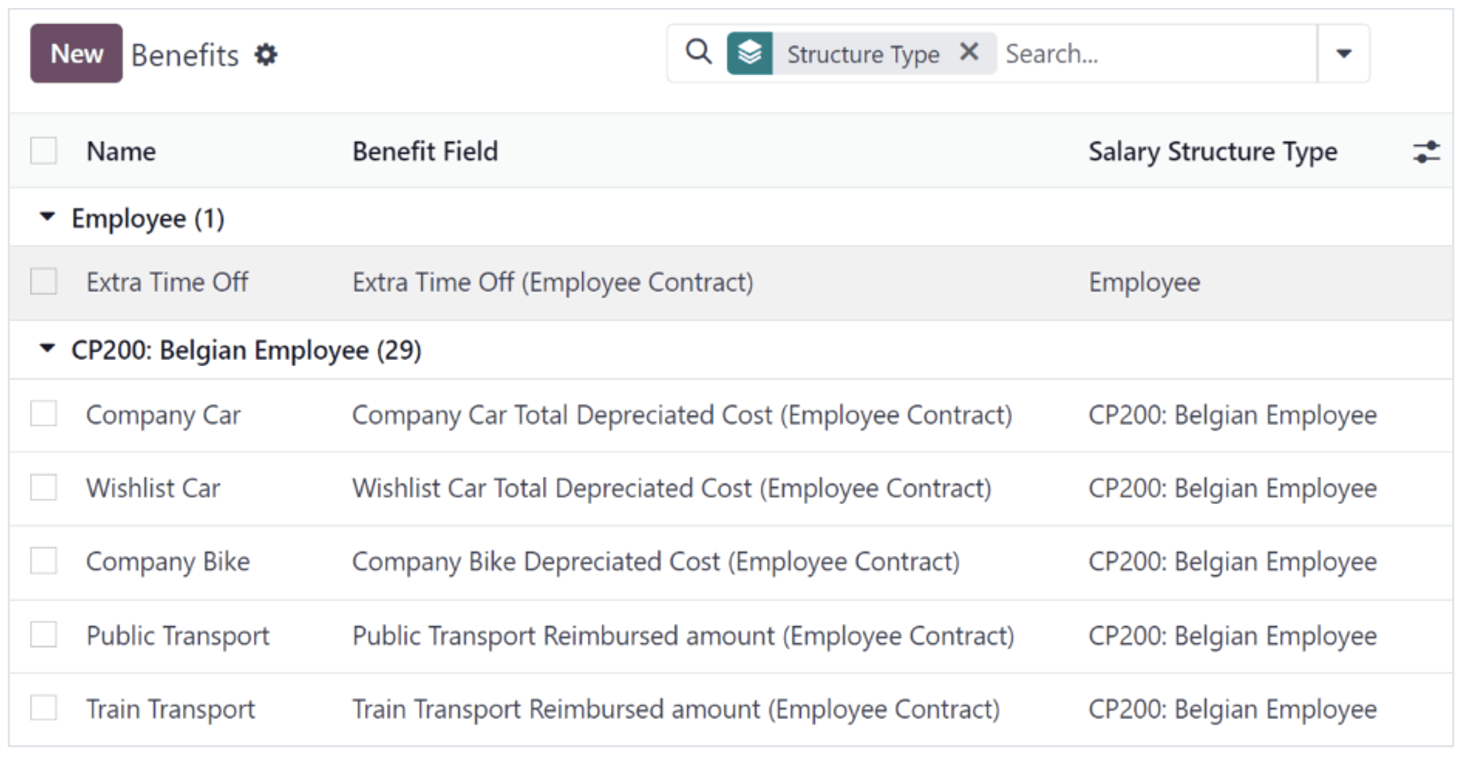 Để xem các quyền lợi, hãy vào Ứng dụng bảng lương ‣ Cấu hình ‣ Cấu hình gói lương: Quyền lợi. Quyền lợi được nhóm theo Loại cấu trúc và quyền lợi được liệt kê cho một loại cấu trúc cụ thể chỉ khả dụng cho cấu trúc cụ thể đó.