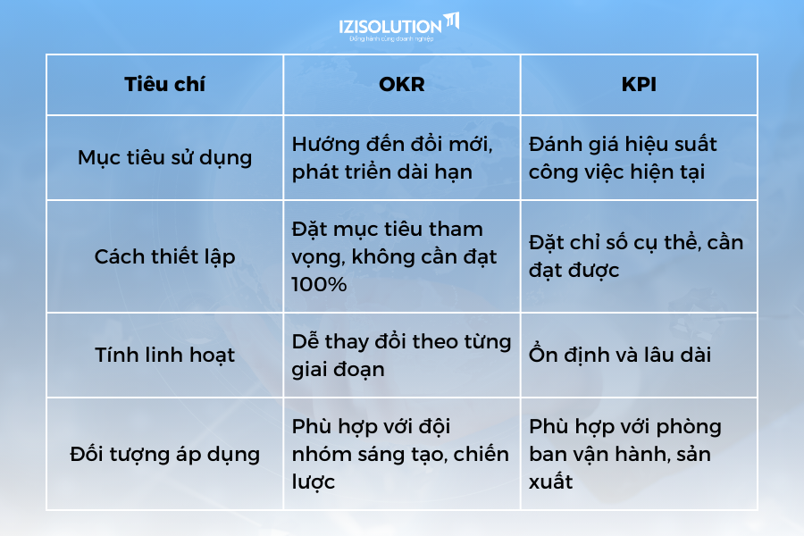 - OKR giúp đội ngũ tập trung vào các mục tiêu lớn và hướng tới sự phát triển dài hạn, trong khi KPI cung cấp dữ liệu thực tế để đảm bảo hiệu suất hàng ngày không bị bỏ sót.