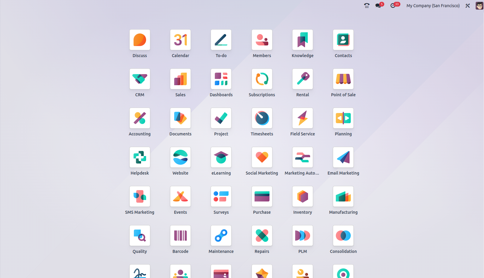 Tính năng quản lý đa dạng: Odoo cung cấp nhiều ứng dụng phục vụ cho các chức năng khác nhau như CRM, ERP, quản lý kho, kế toán, và nhiều hơn nữa. Mỗi ứng dụng đều có khả năng tích hợp mượt mà với nhau, giúp doanh nghiệp quản lý tất cả trong một nền tảng duy nhất.